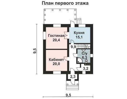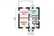 Планировка дома так же проста, как и его внешний вид. Первый этаж продуман так, чтобы можно было легко попасть во все его помещения. Сразу у вход с левой стороны расположено помещения под рабочий кабинет, которое можно переоборудовать под мастерскую или комнату отдыха. Напротив предусмотрен санузел и небольшая кладовая, а дальше по коридору через помещение кухни можно попасть в гостиную комнату площадью 20,4 кв. м.