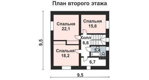 На втором этаже расположены три комнаты, подходящие под спальни и занимающие пространство в 15,6 кв. м., 18,2 кв. м. и 22,1 кв. м.