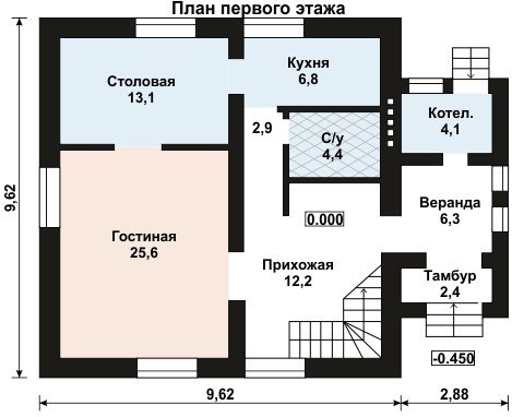 Первый этаж вмещает в себя три просторных жилых помещения, это большая гостиная размером 25,6 кв. м., столовая площадью 13,1 кв. м. и отдельная кухня – 6,8 кв. м. Через парадный вход можно попасть на широкую веранду размером 6,3 кв. м., которая ведет в дом, а так же имеет дополнительный выход в помещение котельной. Кроме того, в котельную можно попасть и с улицы.