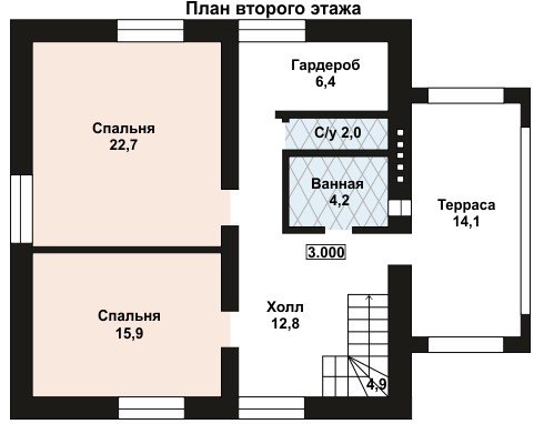 Две большие спальные комнаты второго этажа примыкают друг к другу и объединены общим коридором, из которого так же возможно попасть к общей гардеробной или на просторную террасу-балкон.