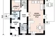 Планировка этажей, как первого, так и второго, имеет общую черту – размещенную ровно посередине несущую стену, что делит оба этажа пополам. Так, на первом этаже правую сторону полностью занимает кухня-гостиная площадью 41,2 кв. м. Она представляет собой главную комнату в особняке и имеет собственный выход на просторную террасу, ведущую далее на придомовую территорию. Левая часть первого этажа распределена между довольно широким холлом, рабочим кабинетом, гостевым санузлом и небольшим помещением для технических нужд.