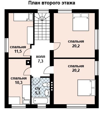 Второй этаж разбит на четыре спальные комнаты, две по 20,2 кв. м. и две – 10,3 кв. м. и 11,5 кв. м.
