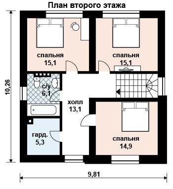 Второй этаж спланирован не менее удобно и оборудован тремя спальными комнатами – 14,9 кв. м. и две по 15,1 кв. м. На этаже имеется общая гардеробная и санузел.
