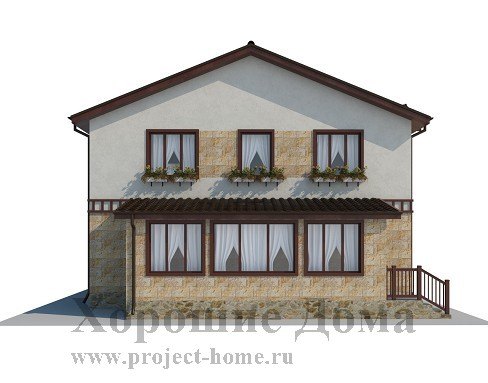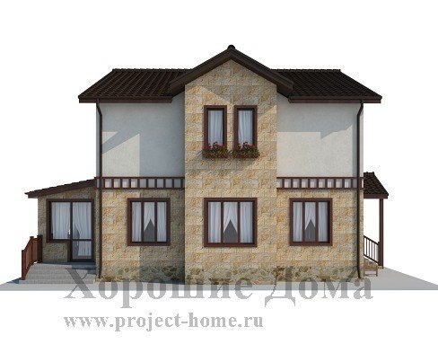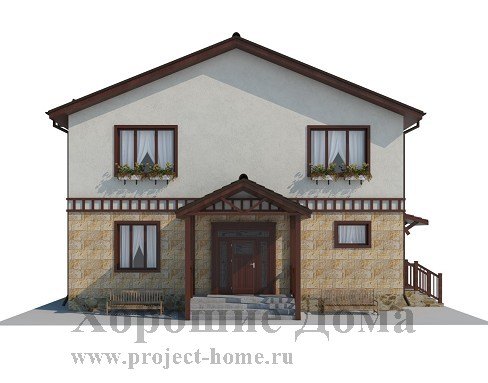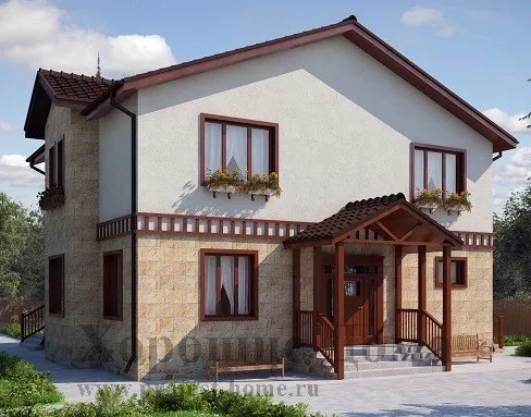 Отделка фасада - натуральный камень и декоративная штукатурка, двускатная крыша покрыта металлочерепицей.