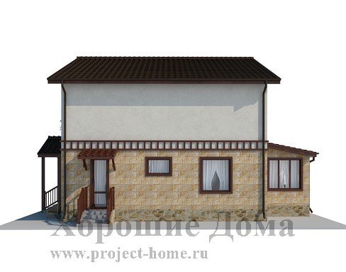 Проект компактного загородного дома в классическом стиле предназначен для проживания небольшой семьи из 3-5 человек. Дизайн фасада коттеджа поражает свой лаконичностью и почти полным отсутствием каких бы то ни было архитектурных излишеств. В качестве украшения дома служит строгий эркер с прямолинейными формами и фасадом, а также деревянные элементы декора фасада, которые придают внешнему облику дома законченный вид и особый колорит. Также из дерева выполнен навес и перила у крыльца на входе в дом.