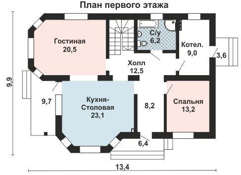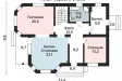 С крытой террасы через главный вход попадаем во внутреннее пространство первого этажа дома, на котором разместились небольшая прихожая, просторный холл, гостевая спальня, котельная и ванная комната. Помещение кухни-столовой украшено эркером и находится по соседству с гостиной, от которой его отделяет только арочный проём. Из помещения кухни имеется выход на крытую террасу. Помещение гостиной увеличено за счёт трёхгранного эркера и не уступает по площади помещению кухни-столовой.
