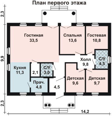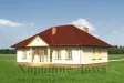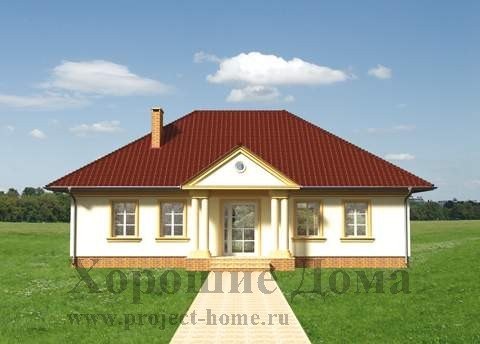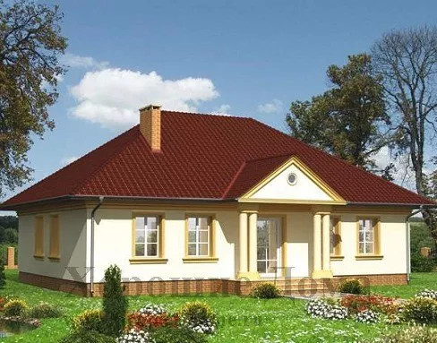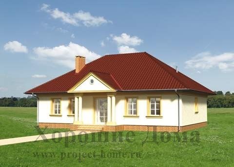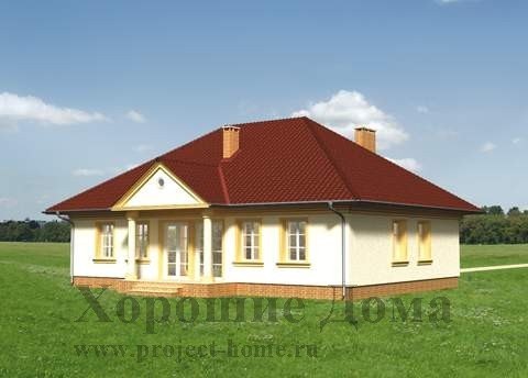 Площадь дома невелика, но очень удобно и рационально спланирована, с учётом всех потребностей обитателей дома. Слева от входа в дом расположена зона дневного пребывания, справа – зона спален. Просторная кухня плавно перетекает в гостиную, в которой по традиции устанавливается камин, в данном случае возможен только электрический. Из гостиной и одной из спален можно выйти в сад.