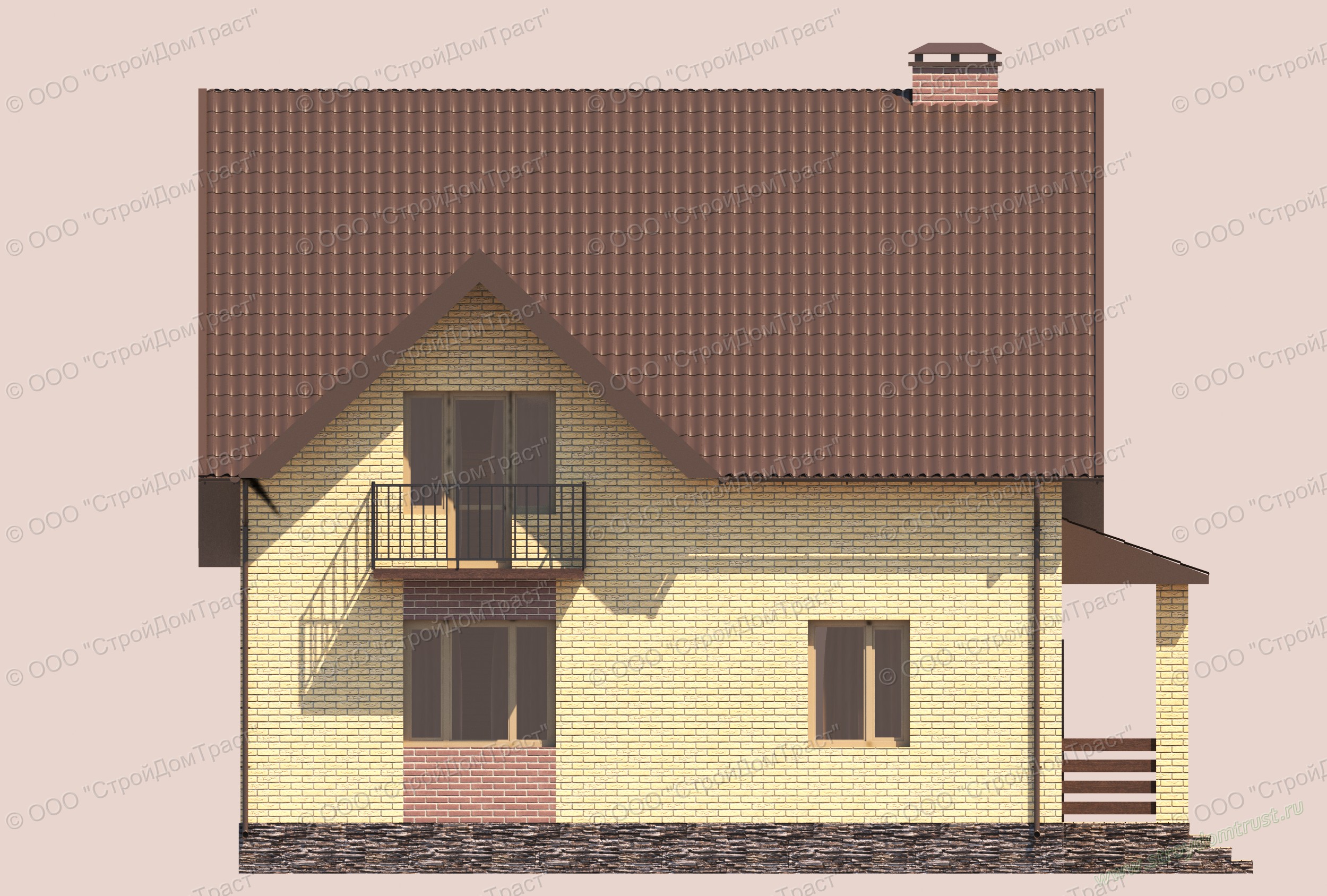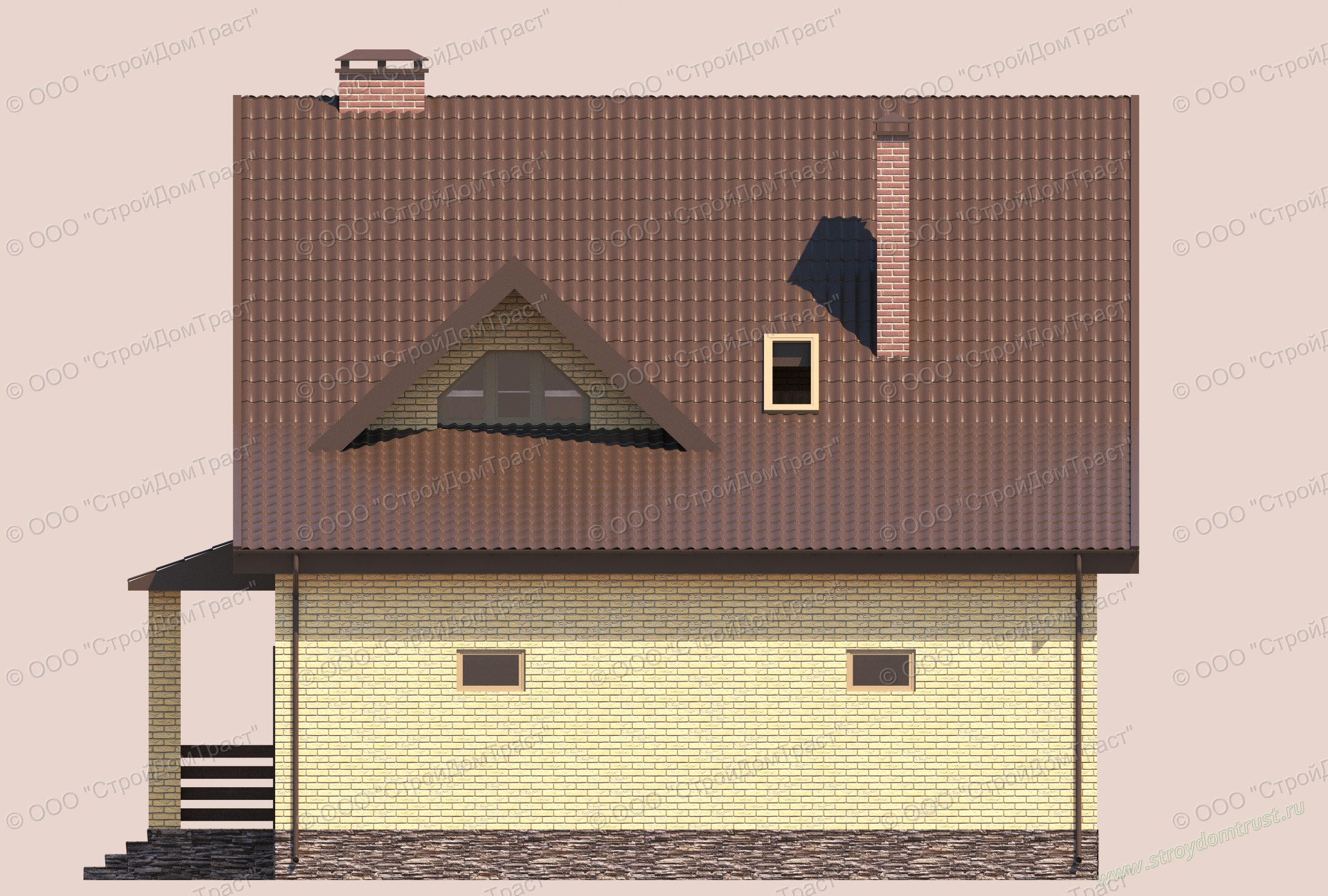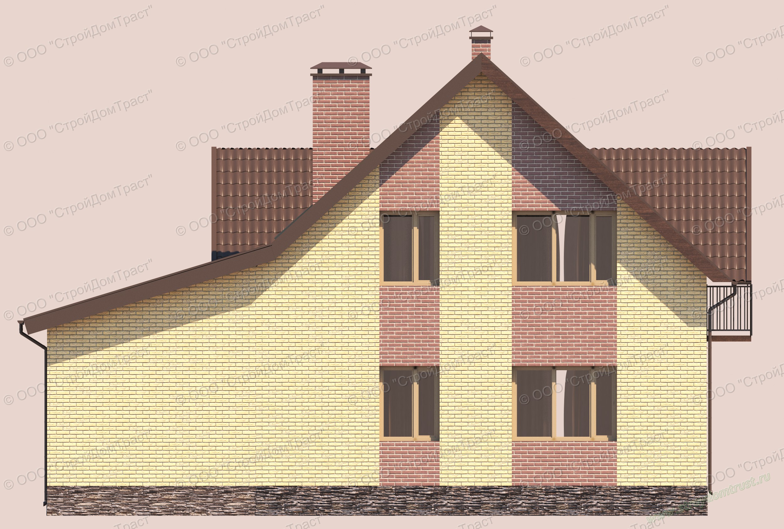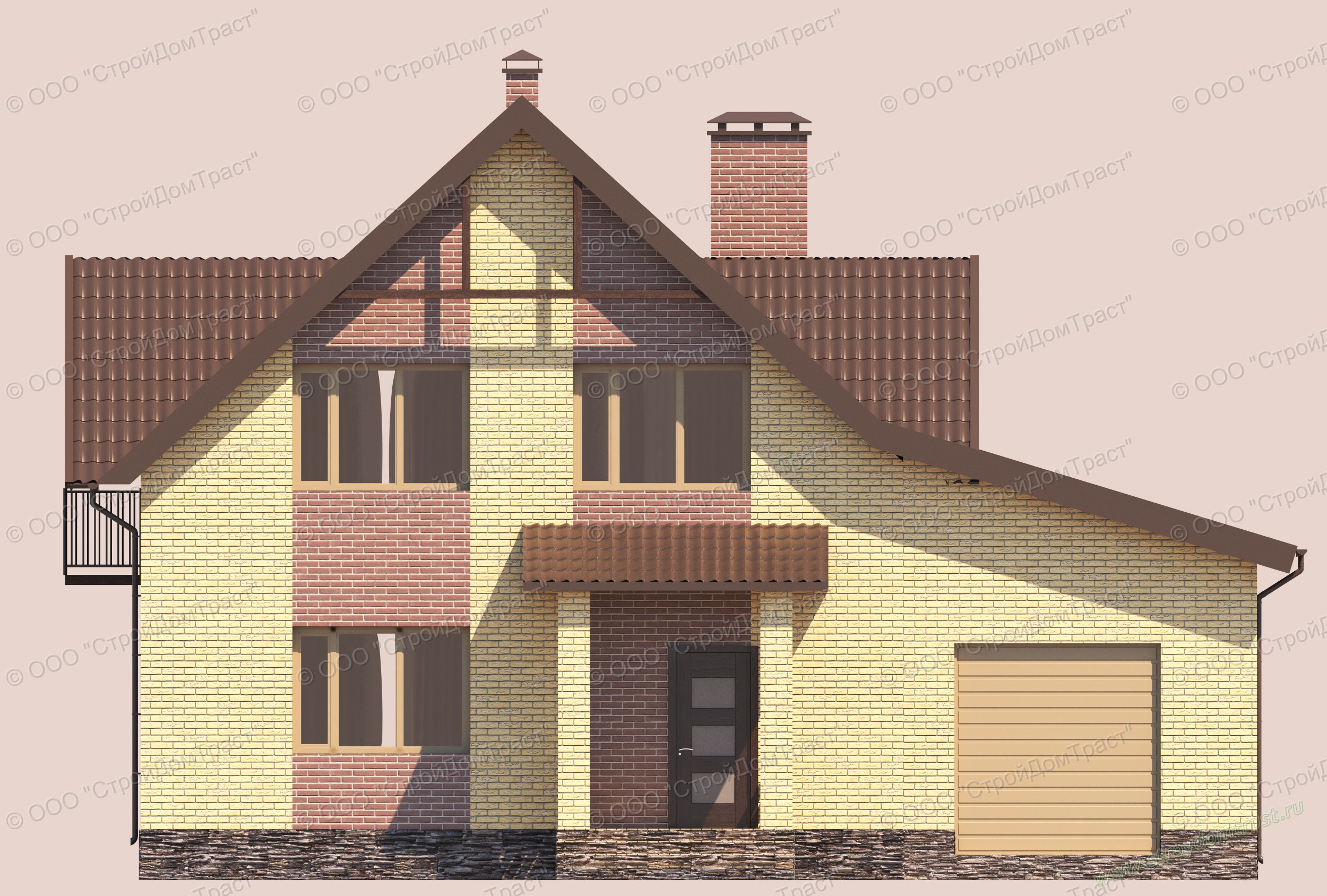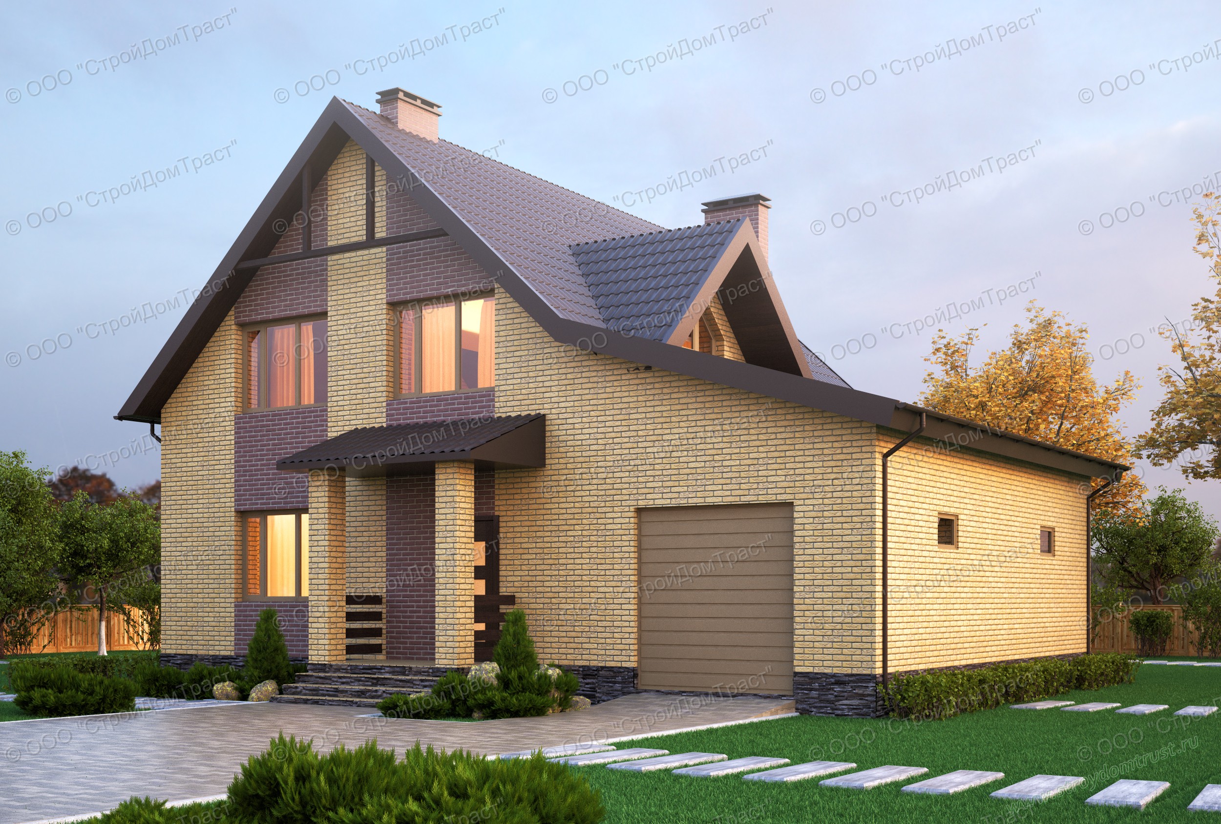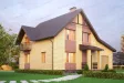 Дом имеет классическую прямоугольную форму, однако выглядит современно за счет использования для отделки стен облицовочного кирпича контрастных цветов и необычной многоскатной крыши. Украшения из балок на фронтоне и крыльце дома придают ему уютный вид.