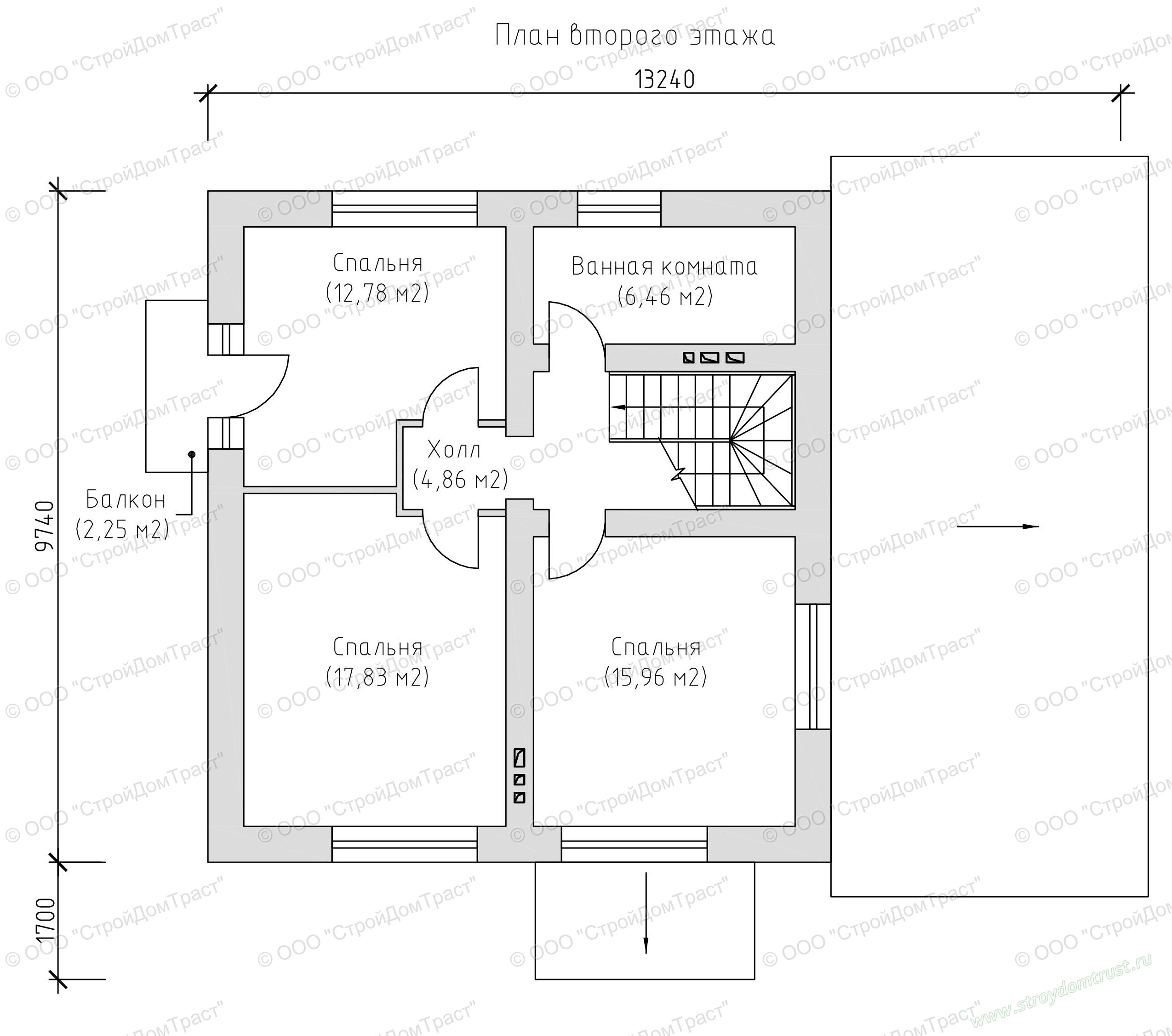На втором этаже три спальни (17,8, 15,9 и 12,8 кв.м). Самая маленькая спальня имеет бонус в виде персонального балкона. Также наверху есть удобная ванная комната (6,5 кв.м).