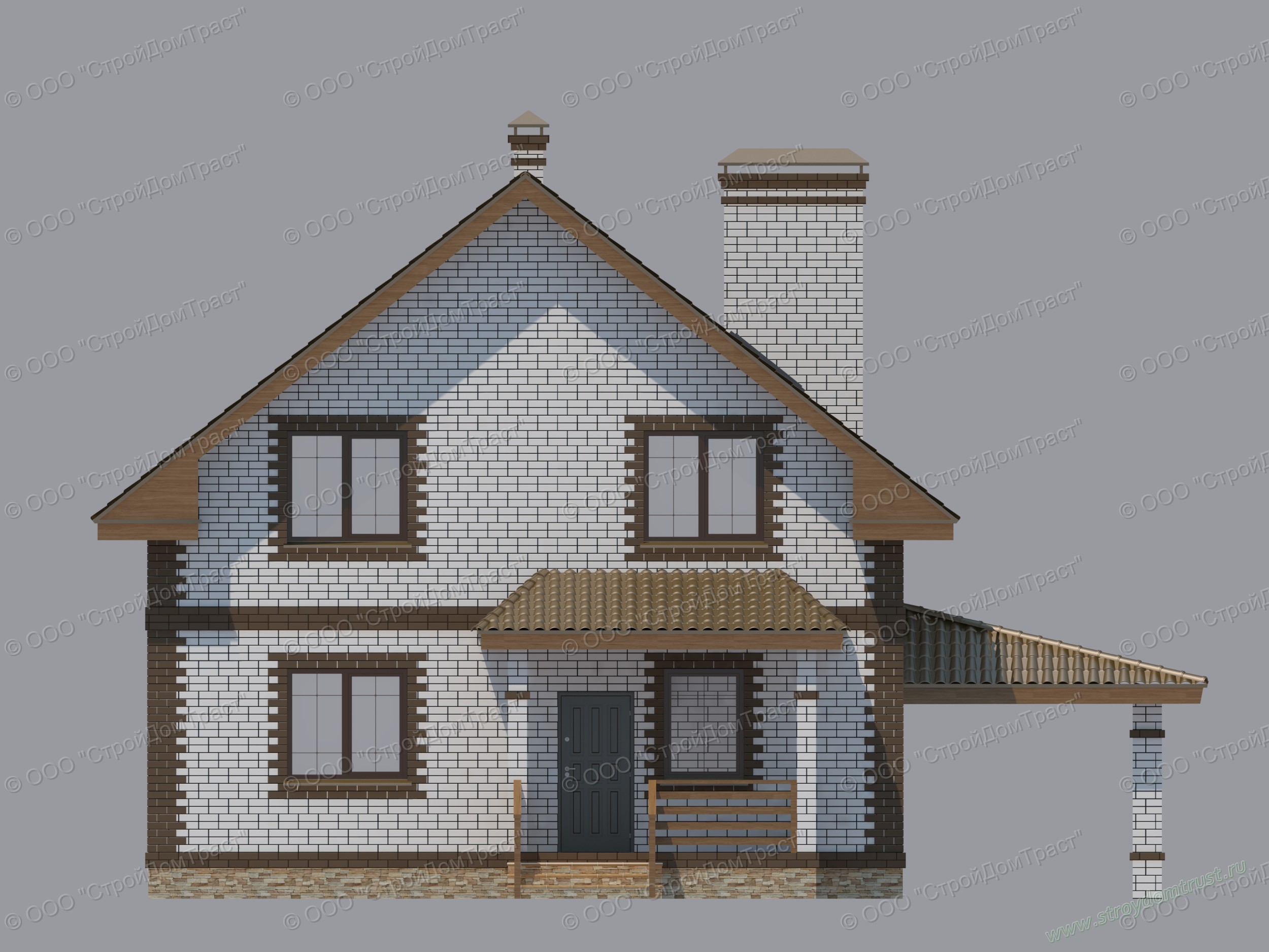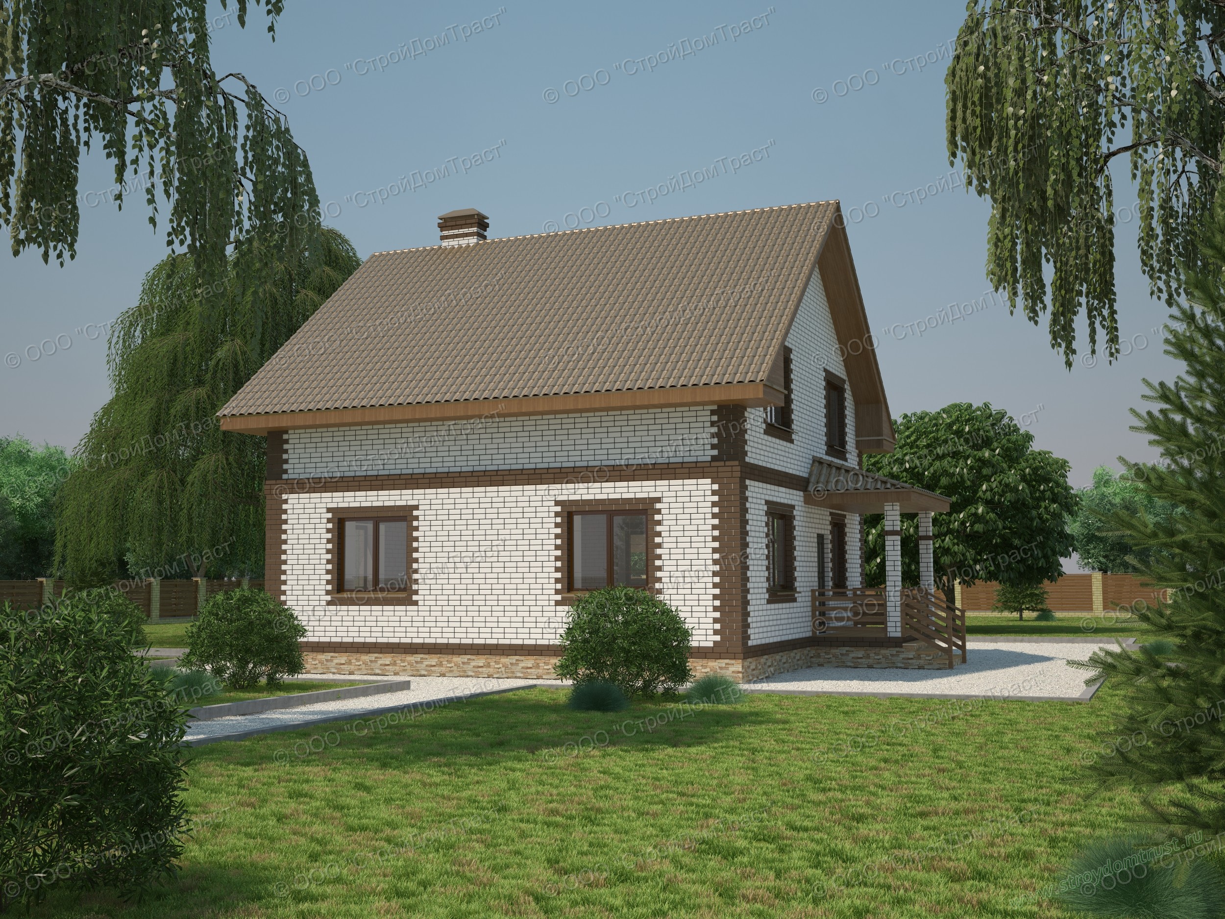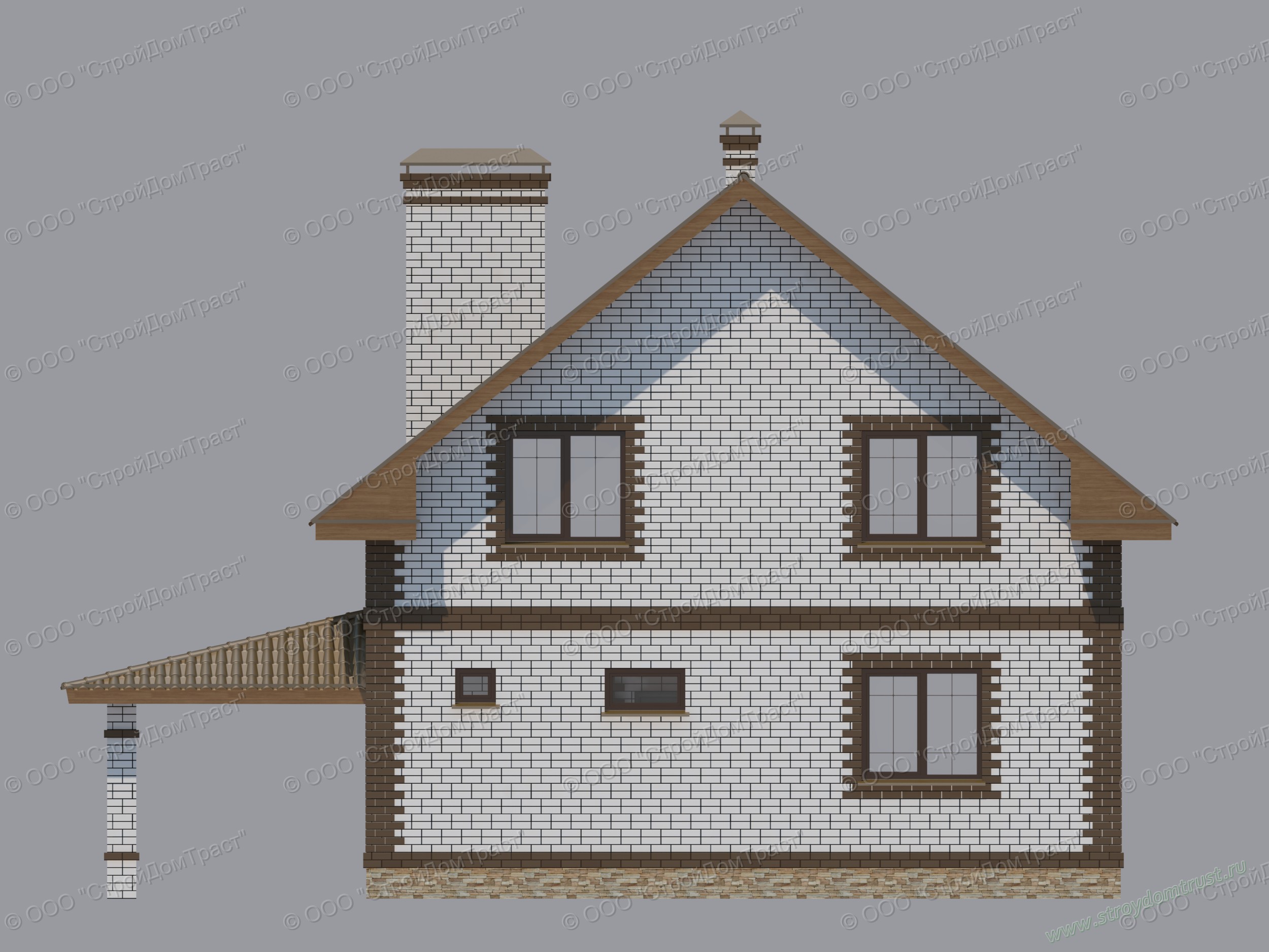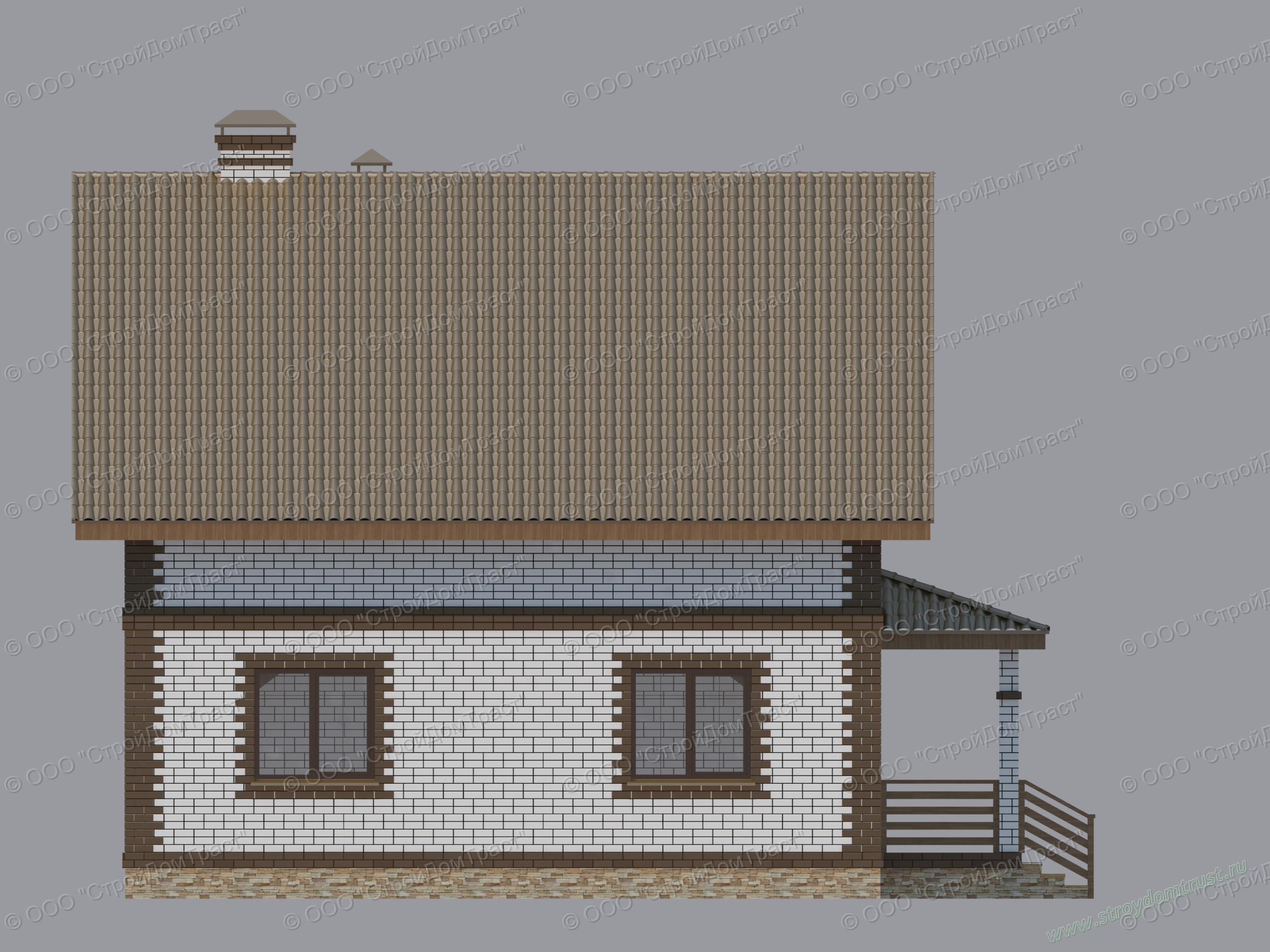 Этот коттедж придется по вкусу тем, кто предпочитает внешнюю простоту и лаконичность в сочетании с эффективной планировкой площади. Дом имеет квадратную форму и симметричную двускатную крышу. Фасад оформлен облицовочным кирпичом двух контрастных цветов, образующих классический узор. Производители этого отделочного материала предлагают широчайшую палитру оттенков, поэтому дом может быть практически любого цвета. Крыльцо украшено колоннами и перилами из деревянных реек.