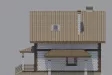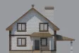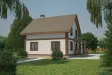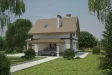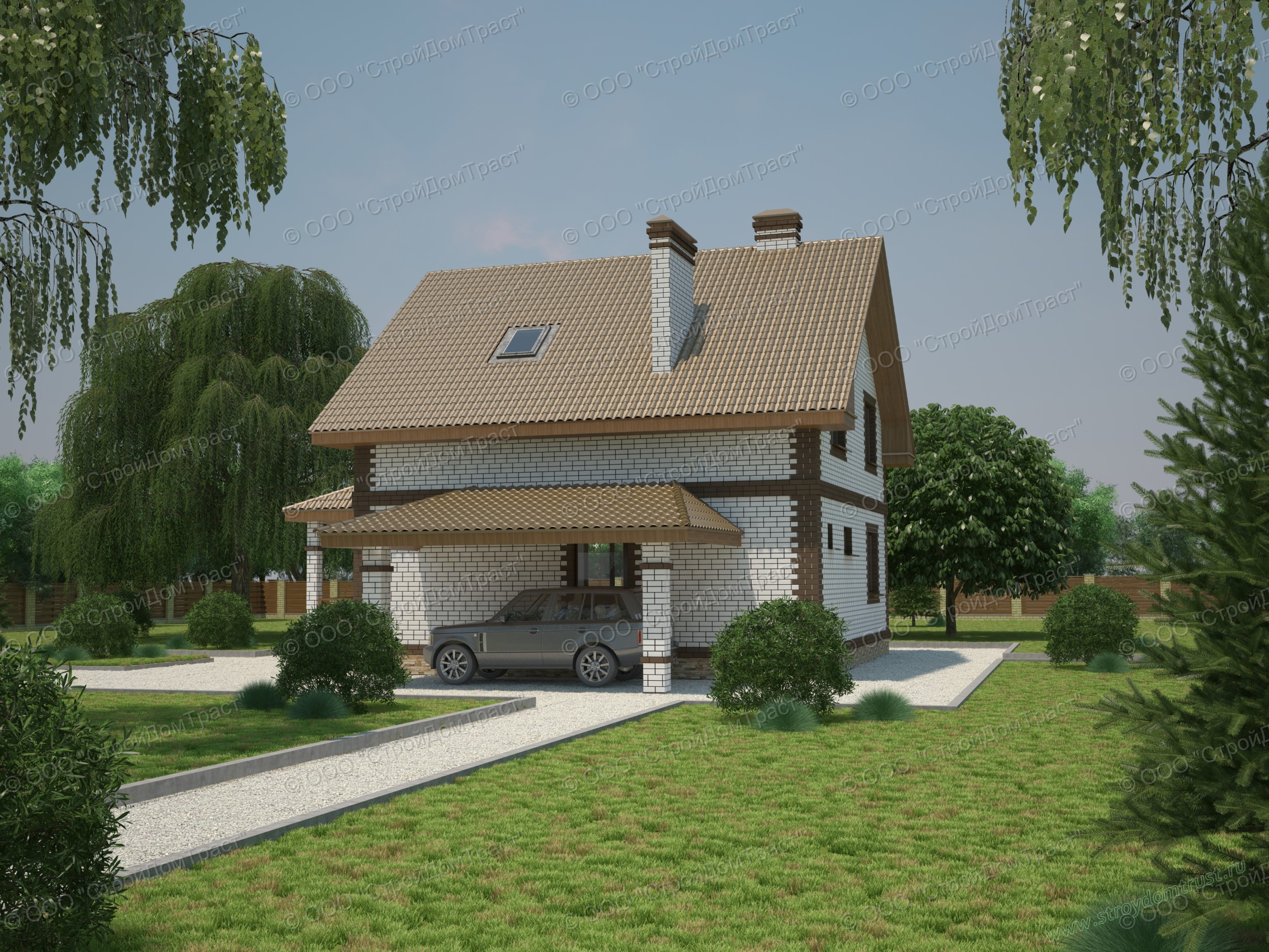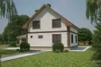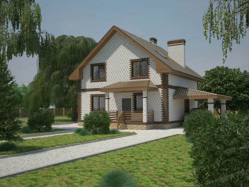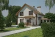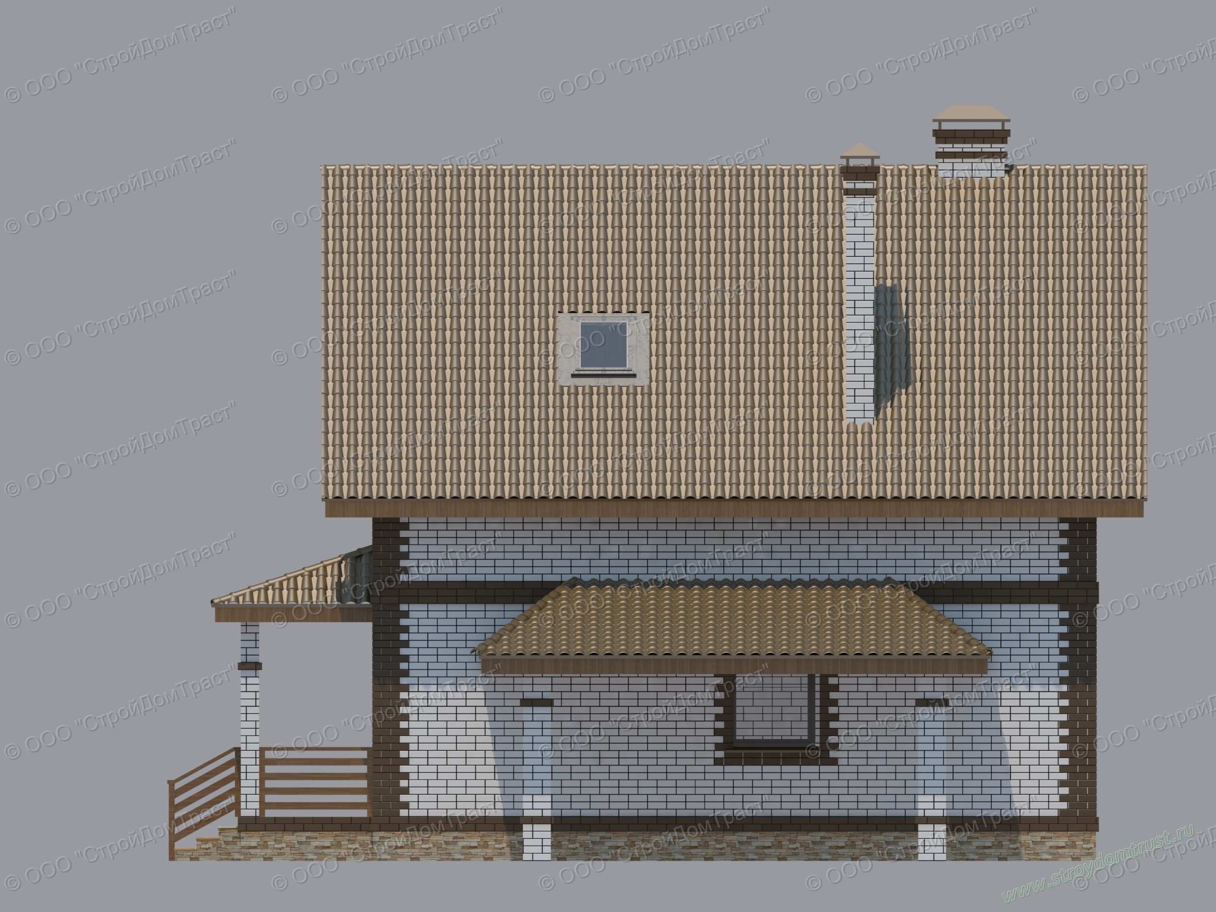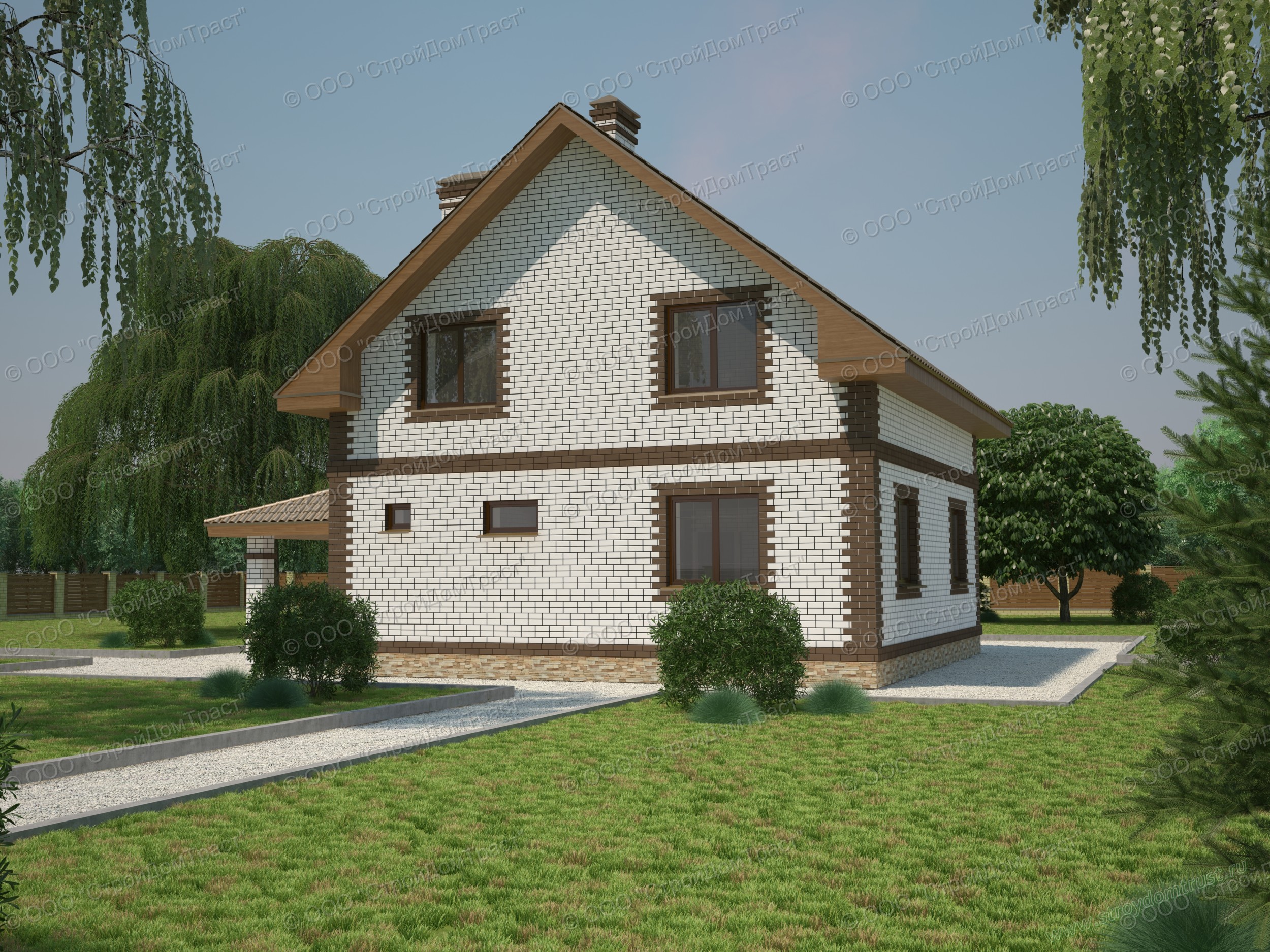 Этот коттедж придется по вкусу тем, кто предпочитает внешнюю простоту и лаконичность в сочетании с эффективной планировкой площади. Дом имеет квадратную форму и симметричную двускатную крышу. Фасад оформлен облицовочным кирпичом двух контрастных цветов, образующих классический узор. Производители этого отделочного материала предлагают широчайшую палитру оттенков, поэтому дом может быть практически любого цвета. Крыльцо украшено колоннами и перилами из деревянных реек.