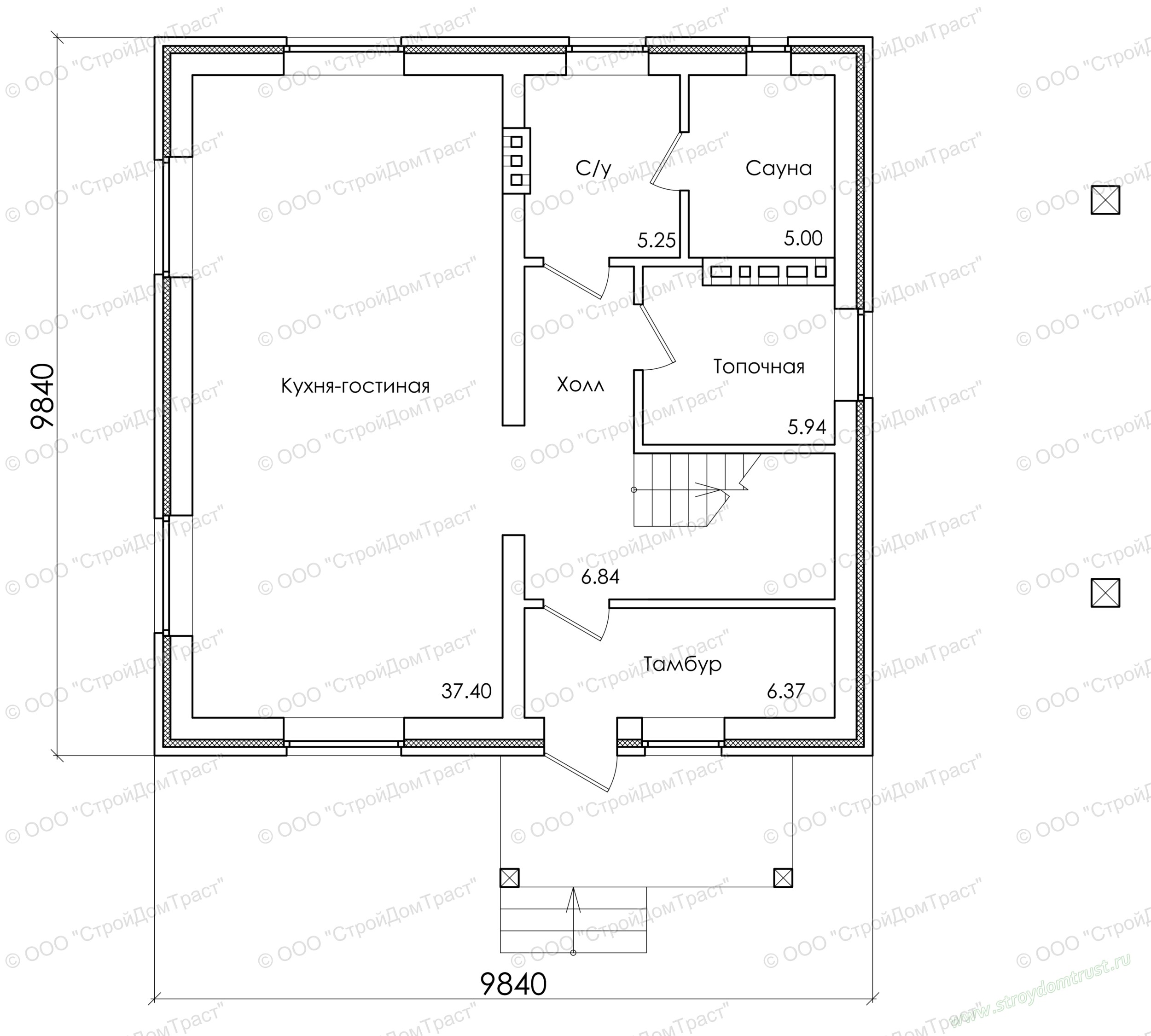 На первом этаже располагается просторная кухня-гостиная (37 кв.м) с хорошим естественным освещением. Планировка комнаты позволяет отделить зону кухни от гостиной дополнительной перегородкой, если обладатели дома предпочитают более строгое функциональное зонирование помещений. Этаж оборудован удобным санузлом и сауной (5+5 кв.м). Также здесь предусмотрены топочная (6 кв.м), тамбур-прихожая (6,3 кв.м), холл (7 кв.м).