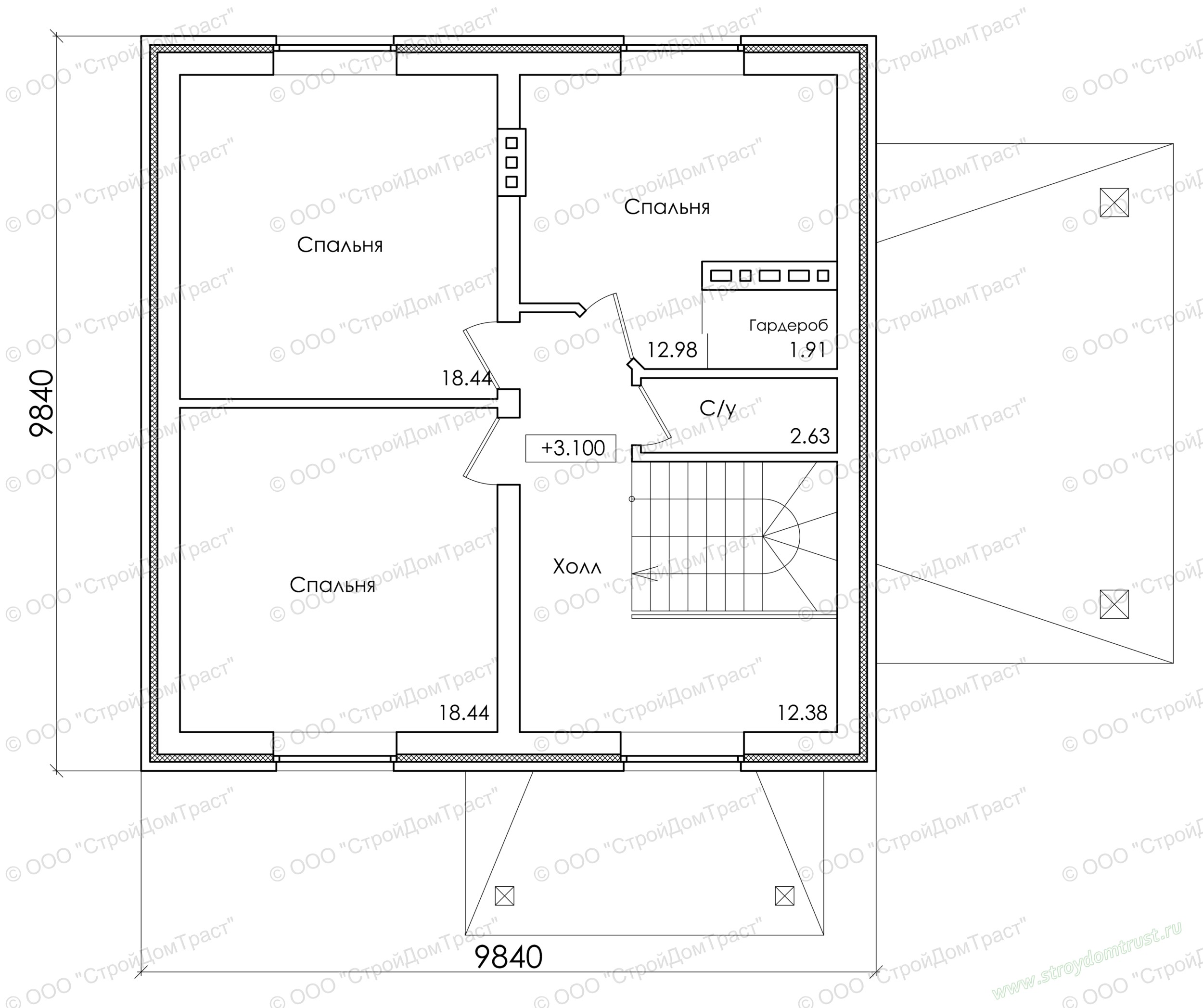 На втором этаже находятся три спальни. Две из них имеют одинаковую площадь и форму (18,4 кв.м). Третья комната имеет немного меньшую площадь, зато оборудована гардеробной (13+2 кв.м). На этаже предусмотрен компактный санузел (2,6 кв.м). Все помещения соединяет холл (12,4 кв.м) с небольшой галереей, где можно разместить мини-гостиную, рабочее место, книжные шкафы, тренажеры или зимний сад.