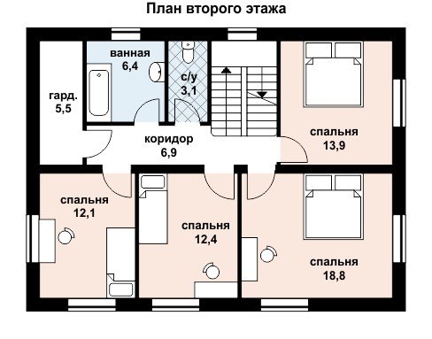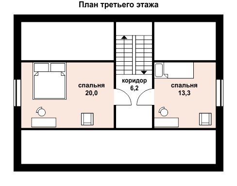 Второй и третий этажи - это спальни, их четыре на втором этаже и две на третьем. В случае использования особняка в качестве мини-гостиницы, спальни в зависимости от площади могут быть оборудованы как одноместные или двухместные номера.