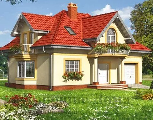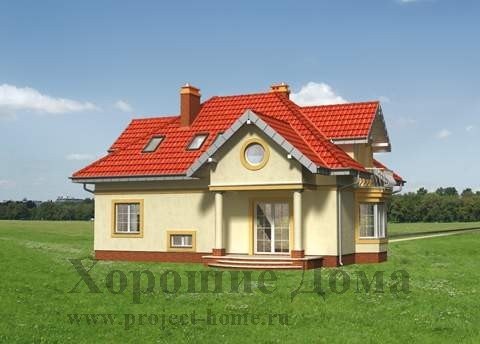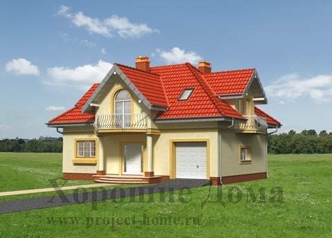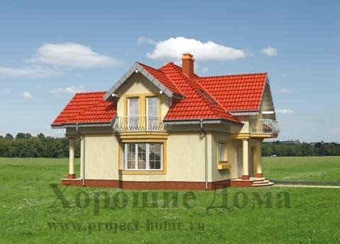Бюджетный проект загородного дома предназначен для проживания небольшой семьи в составе 2-4 человек. Дом очень уютный, светлый, с оригинальной многоскатной крышей, с четырьмя мансардными эркерами - по одному на каждой из сторон дома, изящными французскими балконами и мощными пилонами по сторонам обоих входов в дом.