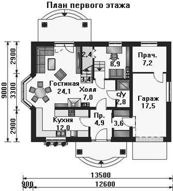 Данный проект интересен также оригинальной внутренней планировкой. На первом этаже слева от входа находится кухня, которая плавно перетекает в столовую и далее в гостиную. Большой камин отделяет пространство гостиной от кухни и холла. Также на первом этаже находятся гостевая спальня, котельная, гараж на одну автомашину и санузел.