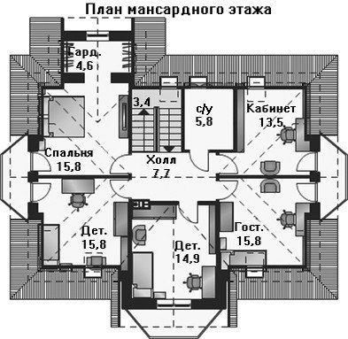 На мансардной этаже расположились спальни: их три, одна из спален оборудована гардеробной комнатой. Также там имеется помещение гостиной, кабинет и санузел. Все спальни и кабинет имеют выходы на балкон.