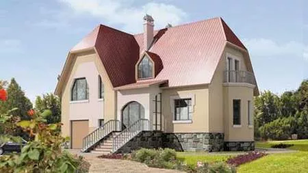 Проект дома из газоблоков 10 на 13 м с мансардой с фигурной крышей