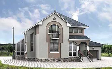 Двухэтажный дом из газобетона 10 на 14 м с полукруглым эркером