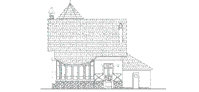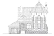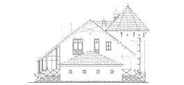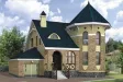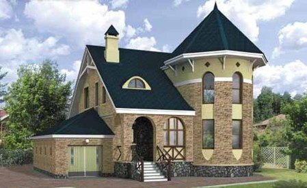 Проект оригинального загородного коттеджа площадью 193,6 кв. м. напоминает сказочный замок и отлично подходит для воплощения и в сельской местности и в городской застройке. Большой двухэтажный круглый эркер с собственной крышей является ярким элементом этого сказочного дизайна. Парадный вход в дом предваряет крытое крыльцо, а слева расположен небольшой гараж-пристройка для одного семейного автомобиля. Семье из 3-5 человек будет вполне комфортно в этом коттедже в течение всего года.