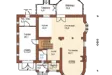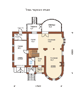 На первом этаже планировкой предусмотрены плавно перетекающие друг в друга гостиная с камином, кухня и столовая. Эркер занимает одну из стен гостиной и оставляет простор для фантазии при дизайне интерьера. Приятным плюсом планировки является наличие полукруглой веранды размером 15,4 кв. м. Спальная зона запроектирована на втором этаже и состоит из трех спален.