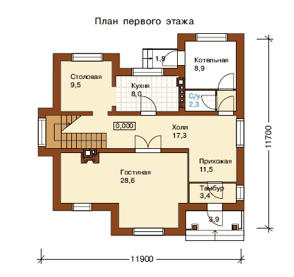 Очаровывающий своим внешним дизайном проект загородного особняка из газоблоков площадью 156,9 кв. м. станет великолепным решением для немногочисленной современной семьи, привыкшей к удобству во всем. Фасады созданы в современном классическом стиле и придают особняку особую изысканность за счет своих простых линий и светлых солнечных оттенков. В этом коттедже будет удобно в течение круглого года семье с составом в 3-4 человека. Планировка еще раз подчеркивает правильный выбор этого особняка. Просторная гостиная, расположенная на первом этаже имеет площадь 28,6 кв. м. и оборудована уютным камином. Территории столовой и кухни разделены на два отдельных помещения и расположены в конце длинного коридора площадью 17,3 кв. м. В комнату котельную возможно пройти из прихожей или с заднего двора.