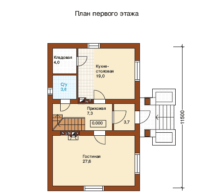 Небольшое крытое крыльцо предваряет парадный вход в коттедж и ведет через тамбур далее в прихожую с лестницей. Большая гостиная занимает территорию в 27,6 кв. м. и находится напротив так же достаточно просторной кухни-столовой. Второй этаж содержит три спальни и небольшой кабинет.