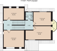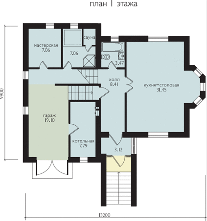 Первый этаж вмещает в себя помещение под мастерскую, расположенное напротив гаража размером 19,1 кв. м. В этой же части дома запроектирована небольшая сауна и котельная. Далее через холл можно попасть в большую гостиную комнату с эркером по одной из стен общим размером 31,45 кв. м.