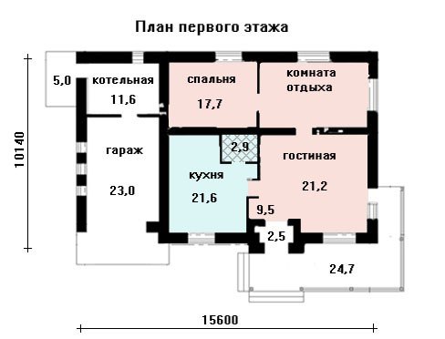 Планировочное решение внутреннего пространства дома очень рационально и эффективно. Через небольшой тамбур на входе в дом попадаем в помещение холла, совмещённого с просторной гостиной. Слева расположена кухня-столовая, а в дальней части дома находится гостевая спальня и двусветная комната отдыха, в которой можно установить домашний кинозал или бильярдный стол.