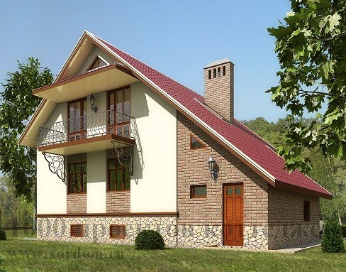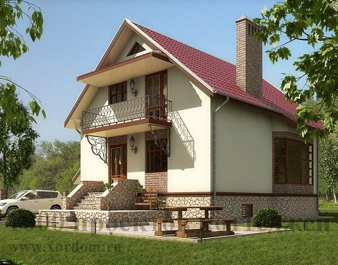Современный загородный коттедж необыкновенно стильного дизайна, с высоким цокольным этажом, асимметричной двухскатной крышей, под которой разместился пристроенный к дому гараж, изящным ажурным оформлением балконов, массивным крыльцом из натурального камня.