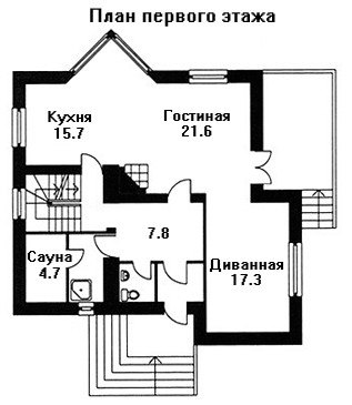 Планировка первого этажа решена в студийном стиле: кухня, столовая и гостиная представлены единым пространством с большим камином в центре помещения и эффектным трёхгранным эркером. Также на первом этаже выделено место под мини-сауну с душевой.