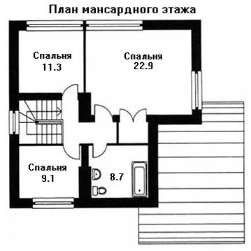 На мансардном этаже разместились три спальни и ванная комната.