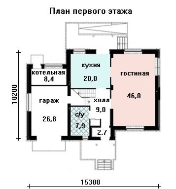 Внутренняя планировка дома выполнена с присущим данному стилю минимализмом. На первом этаже этого коттеджа разместились помещения кухни, санузла и просторной гостиной, в которой обязательно нужно установить большой камин, в данном случае, электрический. В пристроенном с левой стороны дома гараже находится также котельная, оборудованная отдельным входом.