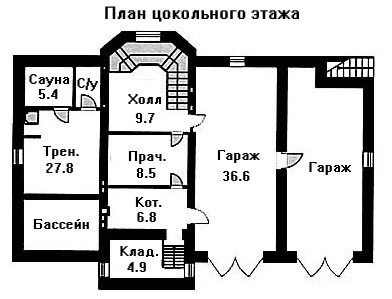 Просторный добротный коттедж из кирпича для постоянного проживания понравится семьям составом от пяти до семи человек. Данный коттедж имеет приятный внешний облик благодаря наличию многогранных эркеров и очаровательного арочного балкона на втором этаже, прямо над парадным входом в особняк. Приятной особенностью этого проекта является возможность его воплощения на участках с перепадом рельефа до 1,5 м. Особняк имеет полноценный цокольный этаж, где размещены два подземных гаража, один из которых вполне можно исключить из проекта при необходимости постройки особняка на узком участке земли. Помимо гаражей в цоколе запроектирована банная зона с бассейном, а так же такие вспомогательные помещения, как прачечная, котельная и кладовая.