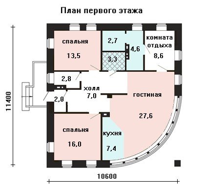 Одноэтажный кирпичный дом с углом, срезанным полукругом
