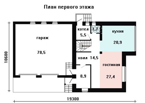 Первый этаж представляет собой единое пространство холла, гостиной и кухни. В дальней части дома, за лестницей, ведущей в мансарду, находятся котельная с отдельным входом со стороны участка и санузел.