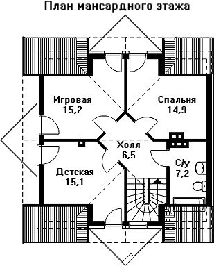 Мансардный этаж спроектирован как зона для отдыха, и там находятся 3 спальни и ванная комната.