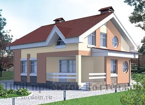 Современный загородный коттедж эконом-класса рассчитан для постоянного проживания небольшой семьи из двух-четырёх человек. Отличительная особенность дома – оригинальные круглые окна, небольшая терраса, укрытая нависающим объёмом коттеджа, высокое двустороннее крыльцо на входе, спокойный дизайн фасада.