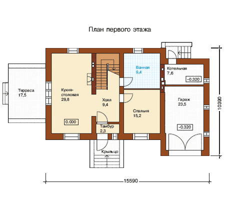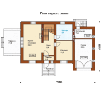 На уровне первого этажа проектом предусмотрен одноместный гараж с площадью 23,5 кв. м. С левой стороны особняка находится довольно просторная крытая терраса, прекрасно подходящая для семейного времяпровождения на свежем воздухе.