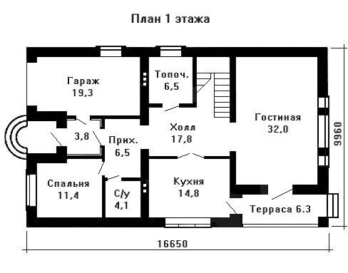 Вход в дом осуществляется через небольшое крыльцо и глубоко утоплен в фасад особняка. В передней части дома размещается встроенный гараж и гостевая спальня, далее следует небольшой холл, плавно перетекающий в гостиную. Помещения гостиной и кухни оснащены выходами на небольшую крытую террасу. Рядом с лестницей располагается территория котельной.