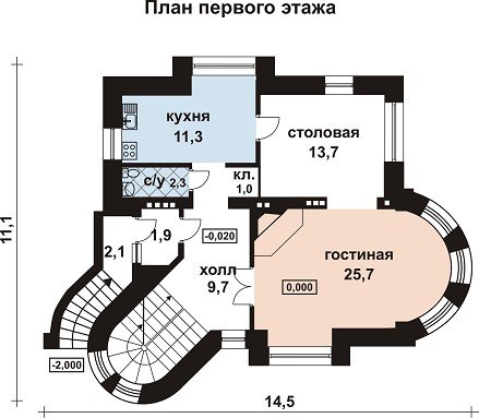 Не надо быть специалистом, чтобы понять насколько удобно и эффективно поделено на комнаты пространство первого этажа. Особенно поражает своей организацией помещение просторной гостиной, площадь которой увеличена за счёт полукруглого эркера. Видное место занимает угловой настоящий камин. Между столовой и гостиной вместо дверей организован просто элегантный небольшой арочный проём. Для небольшого санузла и кладовой для хранения продуктов, что очень удобно, нашлось место перед помещением кухни.