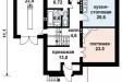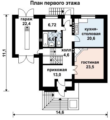 В помещение первого этажа можно попасть с высокого крыльца через небольшой тамбур. На нём разместился минимум помещений для зоны дневного пребывания – это кухня-столовая, гостиная с большим угловым камином и ванная комната. В левой части дома, в пристройке разместился гараж для одной автомашины.