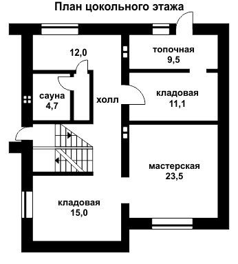 Цокольный этаж является очень функциональным. Здесь расположились помещения для технического обеспечения дома, вместительные кладовые, мастерская и сауна с комнатой отдыха.