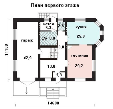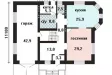 Внутренняя планировка очень проста и эффективна, она обеспечивает высокий уровень комфорта для обитателей дома и его гостей. Первый этаж представлен логическим минимумом помещений для дневного пребывания. Вход в дом выполнен с высокого крыльца через небольшой тамбур, за которым располагается просторный холл, перетекающий в коридор, отделяющий кухню от бытовых помещений. В передней части дома находится большая гостиная с камином с распашными дверьми. С левой стороны от холла разместился встроенный гараж на две автомашины. Площадь гаража частично можно использовать под склад.