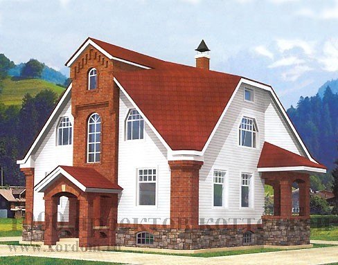 Облицовка цоколя - известняком рваной фактуры или гранитным околом. Декоративные элементы фасадов - красным фасадным кирпичом со швами белого раствора.