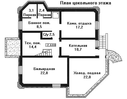 В цоколе находится банный комплекс с комнатой для отдыха и бильярдной. Расположенный рядом холодный подвал станет незаменимым погребом для вина и хранения припасов. По проекту стены подвального помещения – влагонепроницаемы.