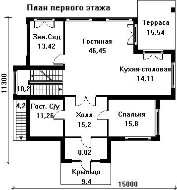 Двухэтажный загородный особняк из кирпича навевает ощущение надежности при первом же взгляде на него. Такой дом будет домашней крепостью для современной семьи из 3-7 человек, мечтающей комфортно обустроиться на лоне природы. Благодаря наличию цокольного этажа дом лишен загромождения лишними хозяйственными и техническими помещениями в жилой части первого и второго этажей. Главной комнатой особняка по праву является гостиная комната общей площадью 46,54 кв. м. с выходом в небольшой зимний сад размером 13,42 кв. м. с одной стороны и выходом на придомовую террасу с другой. Практически не отделена от нее кухня-столовая, расположенная на территории 14,11 кв. м. и образующая с ней вместе помещение Г-образной формы.
