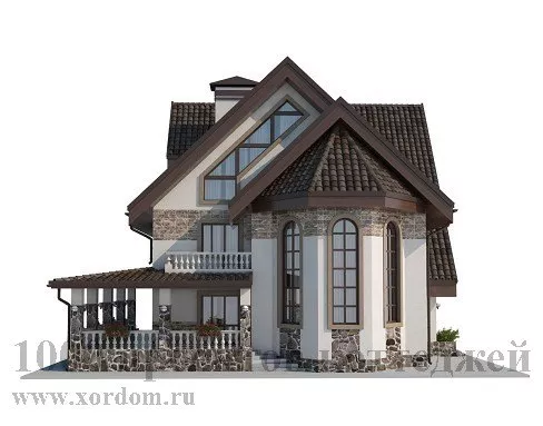 Кирпичный загородный коттедж с готическими элементами в оформлении экстерьера понравится семьям с нестандартным вкусом и численностью 3-6 человек. Обаяние этого особняка объясняется оригинальным подходом к дизайну фасадов. В первую очередь главным украшением здания является двухэтажный полукруглый эркер с собственной крышей, напоминающий башню. Использование камня в отделке фасадов так же привносить свою изюминку в общий стиль.