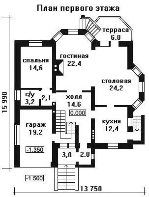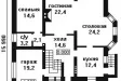 Гостиная, расположенная на первом этаже, предусматривает наличие домашнего камина и занимает площадь в 22,4 кв. м. К ней примыкает столовая, практически не отгороженная от гостиной, но выделенная, как отдельная комната. Гараж, размещенный в левой части коттеджа, имеет площадь 19,4 кв. м. и позволяет разместить один автомобиль.