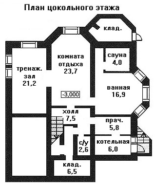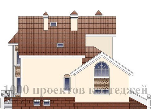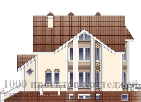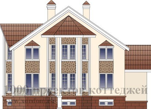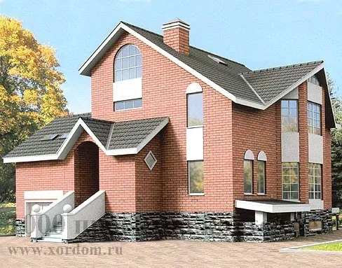 Дом из кирпича с довольно рациональными фасадами, свойственными для классицизма, станет прекрасным выбором для семьи из 3-4 человек. При всей своей внешней просторе дизайн коттеджа разбавлен приятными глазу акцентами в виде небольшого эркера на два этажа, арочными окнами и парадным входом, обрамленным аркой. В доме есть цоколь, занимающий практически всю территорию под особняком. Тут находятся две кладовые, прачечная и котельная, а так же банный блок с тренажерным залом и комнатой отдыха.